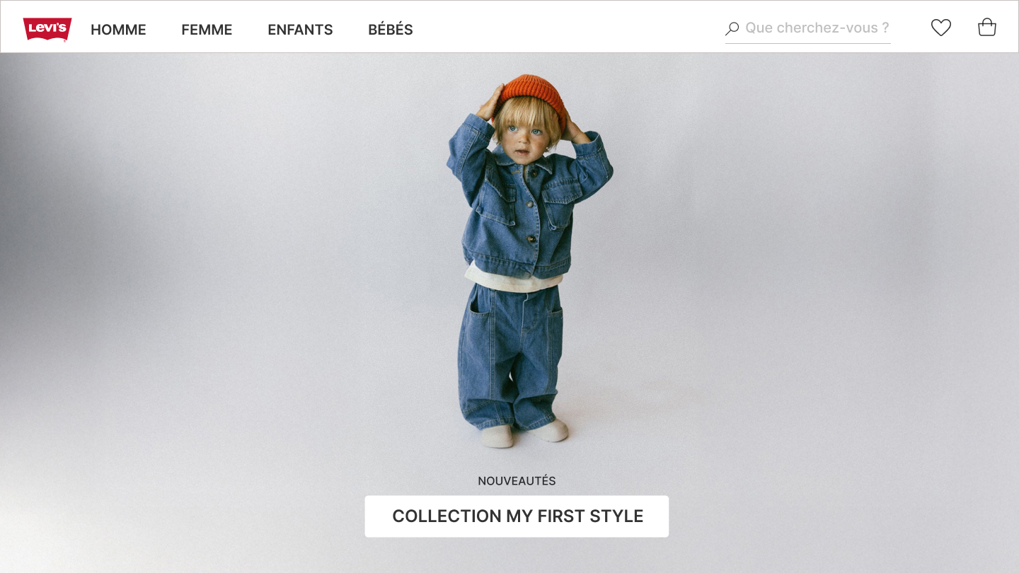 This school project aimed to enrich the existing website by adding a baby collection to the Levi’s website. The goal was to propose a seamless integration that respects Levi’s visual identity while adapting it to a younger target audience. The project focused on clarity, consistency, and usability in order to ensure an intuitive user experience and present the new baby collection in a natural way that remains faithful to the brand’s universe.
